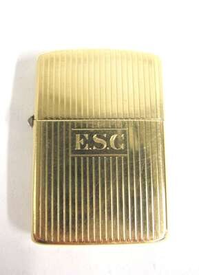 Rounded rectangular form with ribbed body, monogrammed E.S.C, stamped "Zippo 14kt" to base of case, in original fitted box.