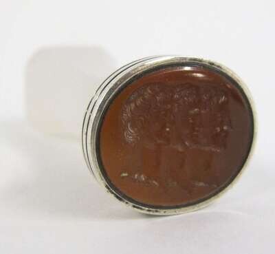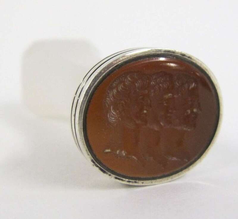 The carnelian-colored glass matrix with classical intaglio depicting three heads in profile, mounted with a faceted glass handle.