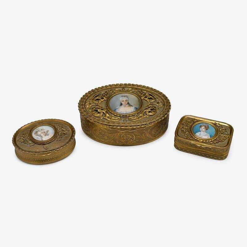 Comprising a large oval box, a small oval box and a rectangular box, each inset to the top with a portrait miniature of a beauty and cast with foliate decoration. (3).
