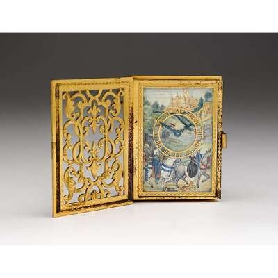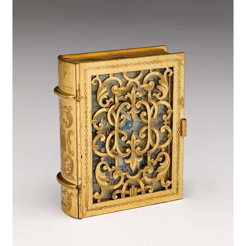 The reticulated and engraved cover opening to reveal a pierced gilt bronze dial applied on an enameled panel with hand-painted medieval scene, marked "Gubelin Swiss," the spine engraved "Livre d'Heures," the back cover monogrammed.