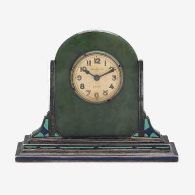 Art deco nephrite jade and enameled silver eight day desk clock retailed by Tiffany & Co., circa 1930