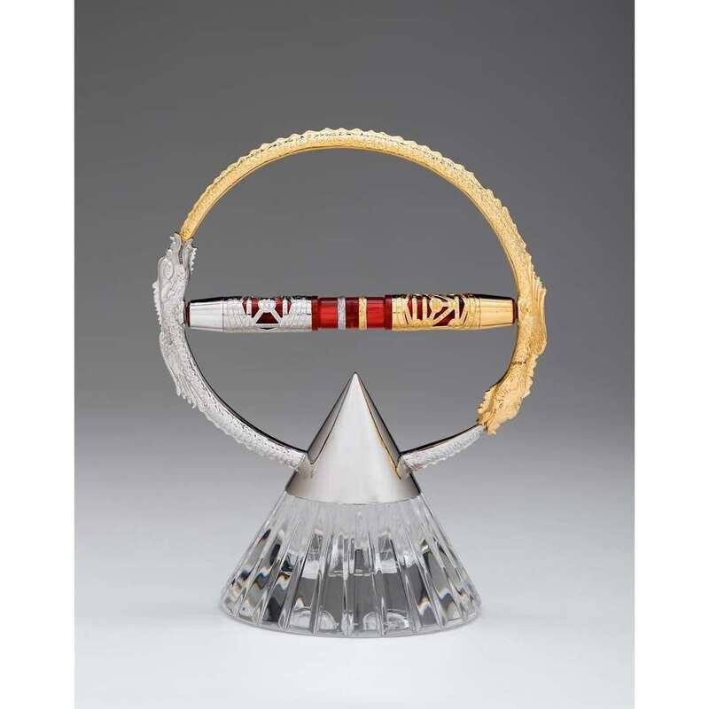 The double-nibbed fountain pen with red resin barrel and two separate sections, each half with overlay silver and gold-plate engraved with symbolic elements, the pen is magnetically suspended inside a display with two dragons forming a circle, held by a cone-shaped dual reservoir crystal inkwell, with original box and papers, and eyedropper.