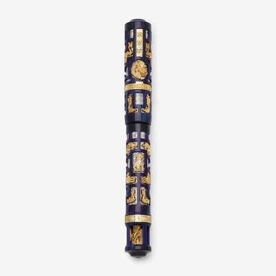 The sterling silver barrel overlay with marbled blue resin, vermeil miniatures representing Chinese mythological figures throughout, with 18-karat gold nib, with original pagoda-shaped box and papers.