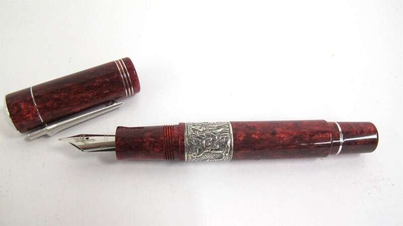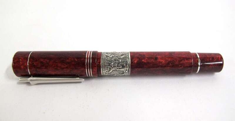 The red marbled celluloid body with sterling silver trim and decorated with images of the warrior, the clip depicting a horseman's lance, with 18-karat gold nib, with original box and papers.