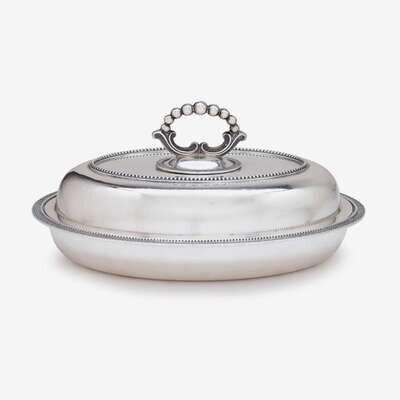 Oval, with Greek-key rim and beaded border, the top with beaded edge and removable scroll and beaded handle within Greek-key border.