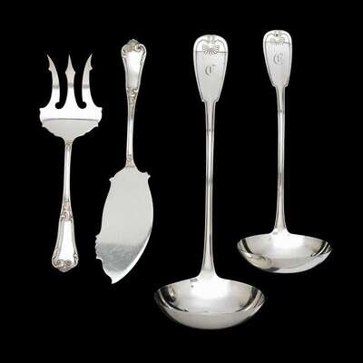 "Palm" pattern, comprising a punch and soup ladle, monogrammed; together with an Italian silver fish serving set, .800 standard. (4).