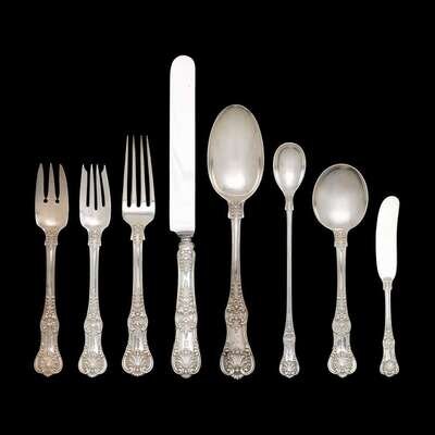 "English King" pattern, comprising eight each dinner knives and forks, salad forks, butter spreaders, cream soup spoons, iced teaspoons; six dessert forks; one tablespoon; monogrammed. (55).
