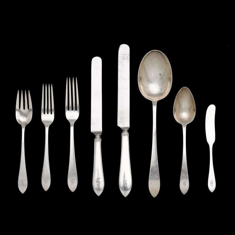 "Faneuil" pattern, comprising seven each luncheon knives, dinner forks, and salad forks; six each dinner knives and place spoons; five luncheon forks; eight butter spreaders; and two serving spoons, monogrammed.