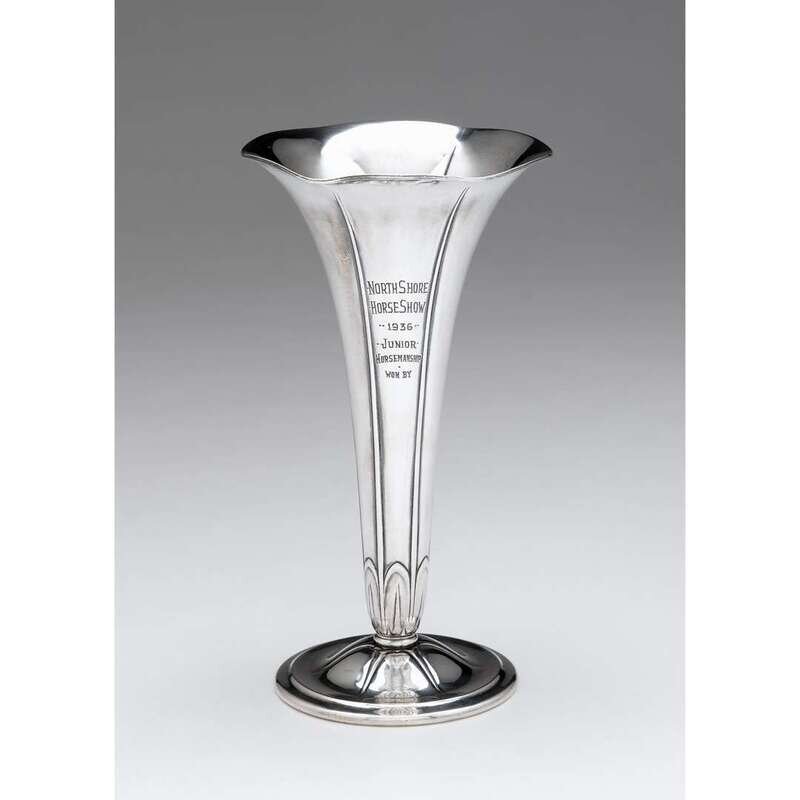 Trumpet-form paneled vase with scalloped rim raised on circular foot, engraved "North Shore Horse Show 1936 Junior Horsemanship won by."