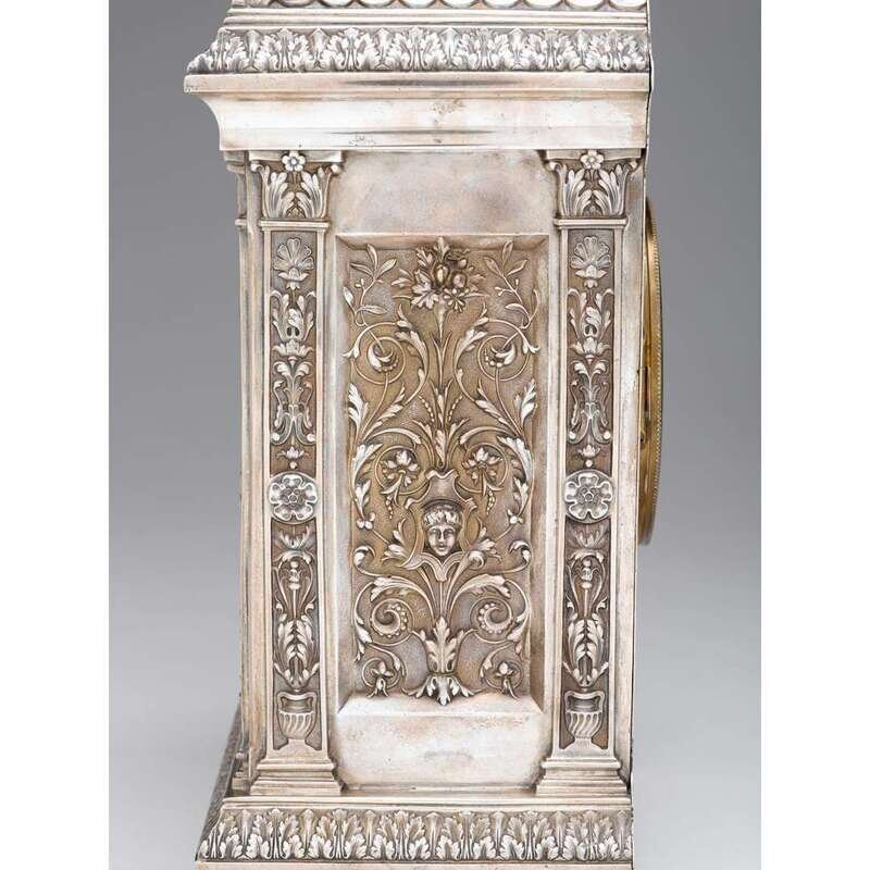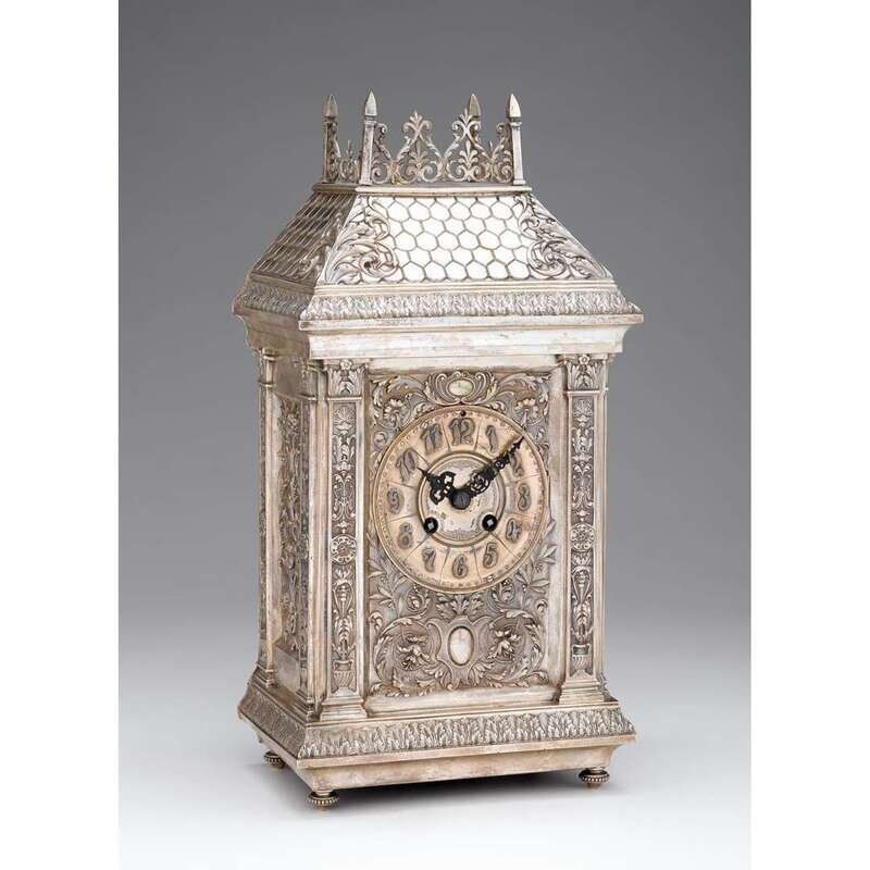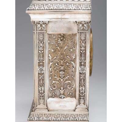Silver architectural mantle clock possibly Gorham, apparently unmarked