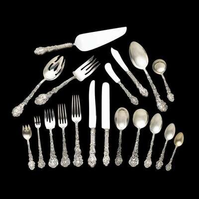 "Versailles" pattern, comprising twenty-four dinner knives: twelve with new French blades, seven with blunt blades, five with old French blades; twenty-four dinner forks; twelve each butter spreaders, luncheon forks, salad forks, cream soup spoons, bouillon spoons, ice cream forks with gilt-washed bowls; thirty-nine teaspoons; nineteen cocktail forks; seventeen demitasse spoons with gilt-washed bowls; eleven five o'clock spoons; two serving spoons of different sizes; one salad serving fork and spoon; one each master butter, cake server; with various motifs and monograms. (257).