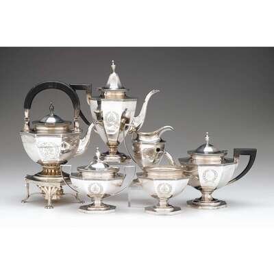 Comprising a hot water kettle on stand, coffee and teapot, covered sugar, creamer, and wastebowl, of octagonal urn-form with linear band at shoulder and angular handle, raised on conforming pedestal foot, the pots with domed cover surmounted by an urn-form finial, each engraved with monogram below a crest of a bearded man within a wreath cartouche. (6).