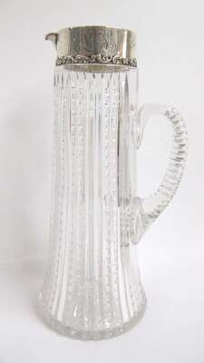The cut-glass pitcher of elongated form, the silver-mounted top with C- and S-scrolls, monogrammed.