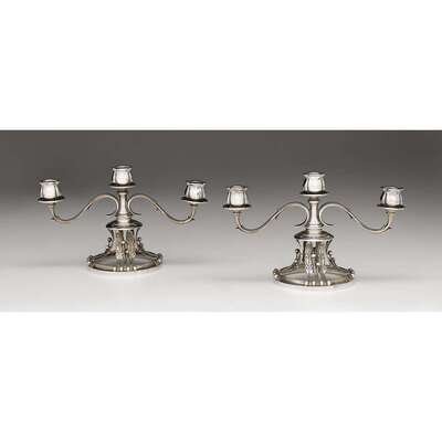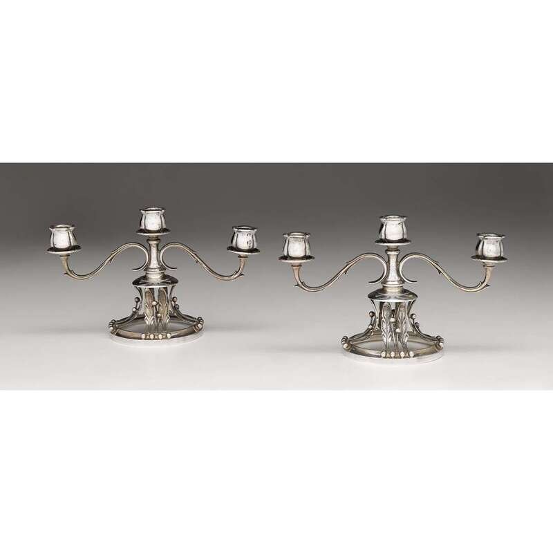 Pair of sterling silver three-light candelabra, in the style of Georg Jensen Nicholas Schelnin Co., New York, NY, 1904-09