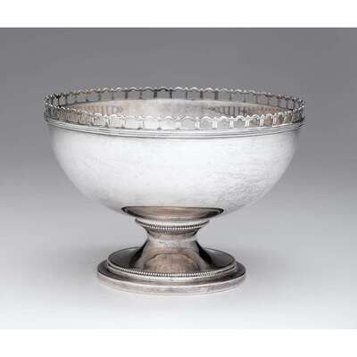 Circular bowl with openworked rim above a beaded border, raised on circular pedestal foot.