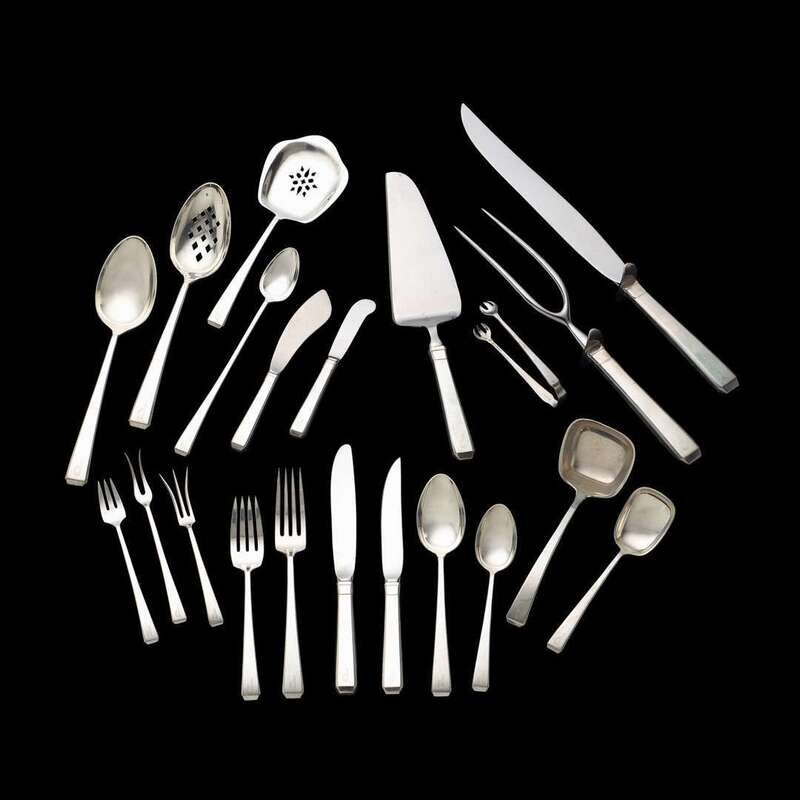 "Craftsman" pattern, comprising twelve each dinner knives, steak knives, butter spreaders, dinner forks, salad forks, cocktail forks, iced tea spoons; seventeen teaspoons; six place spoons; three tablespoons; two lemon forks; two sugar nips; one carving fork and knife; one each pierced tablespoon, olive fork, pierced bon bon spoon, ladle, master butter knife, cake server, and sugar scoop; monogrammed P. (123).