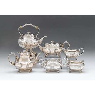 Comprising a hot water kettle on stand, coffee and teapot, covered sugar, creamer, and open wastebowl, rounded rectangular form with fluted lower half and lid, raised on four acanthus-capped paw feet, monogrammed. (6).