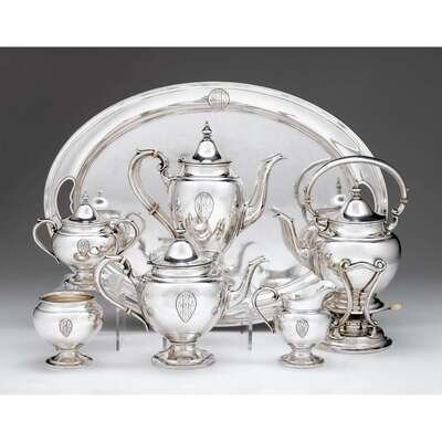 Comprising a hot water kettle on stand, a coffee and teapot, covered sugar, creamer, wastebowl, and twin-handled oval tray; baluster form with hinged domed cover, applied monogram within teardrop cartouche. (7).