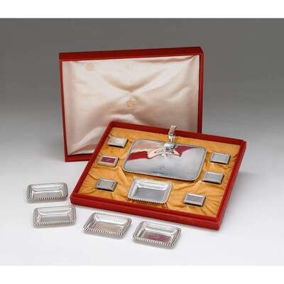 Comprising a cigarette holder, six match safes, and five ashtrays, each with gadrooned edge, monogrammed N, in original Cartier box. (12).
