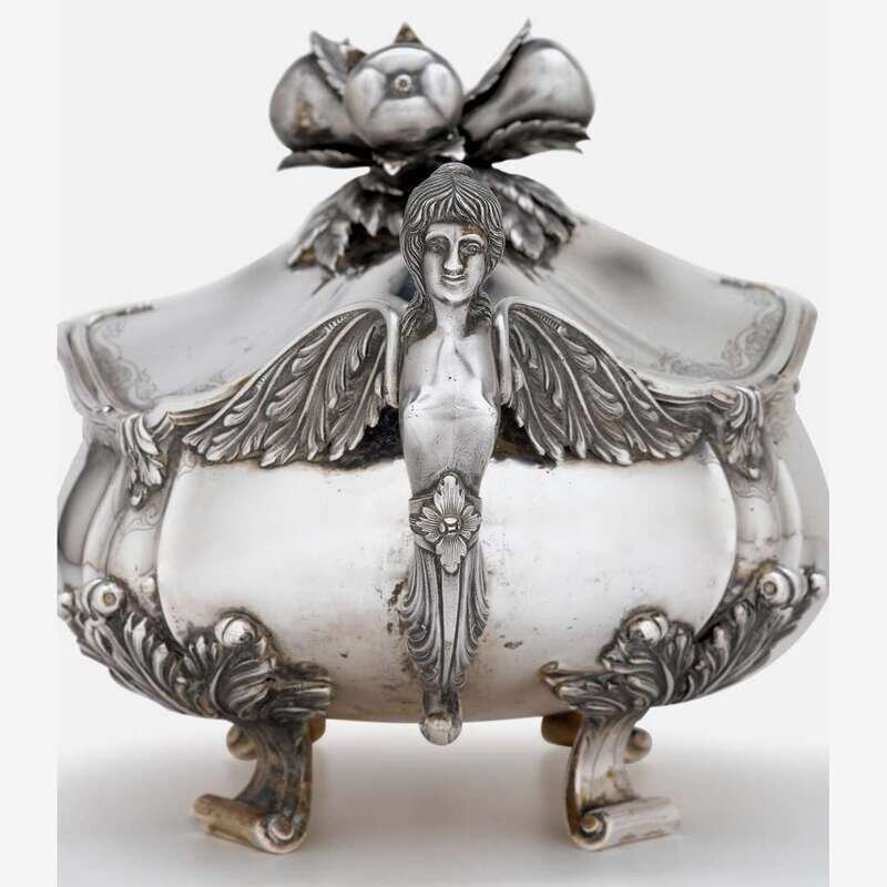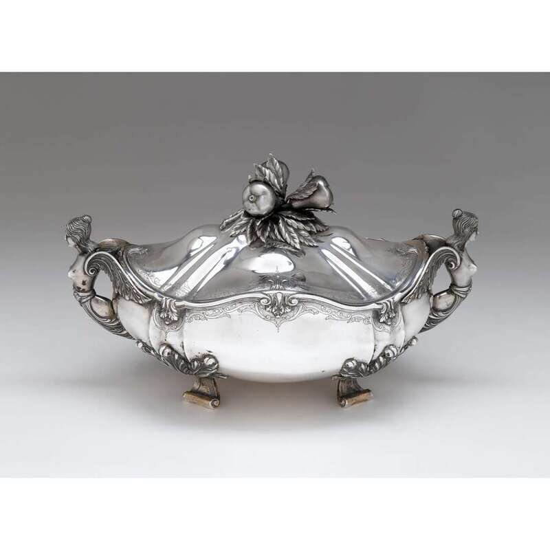 The lobed oval form body with scalloped rim decorated with engraved and applied scrolling foliage, with twin winged maiden-form handles, raised on four acanthus-capped scroll feet, the scalloped cover surmounted by three pears blossoming from chased leaves, similar engraving to edges, .916 standard.