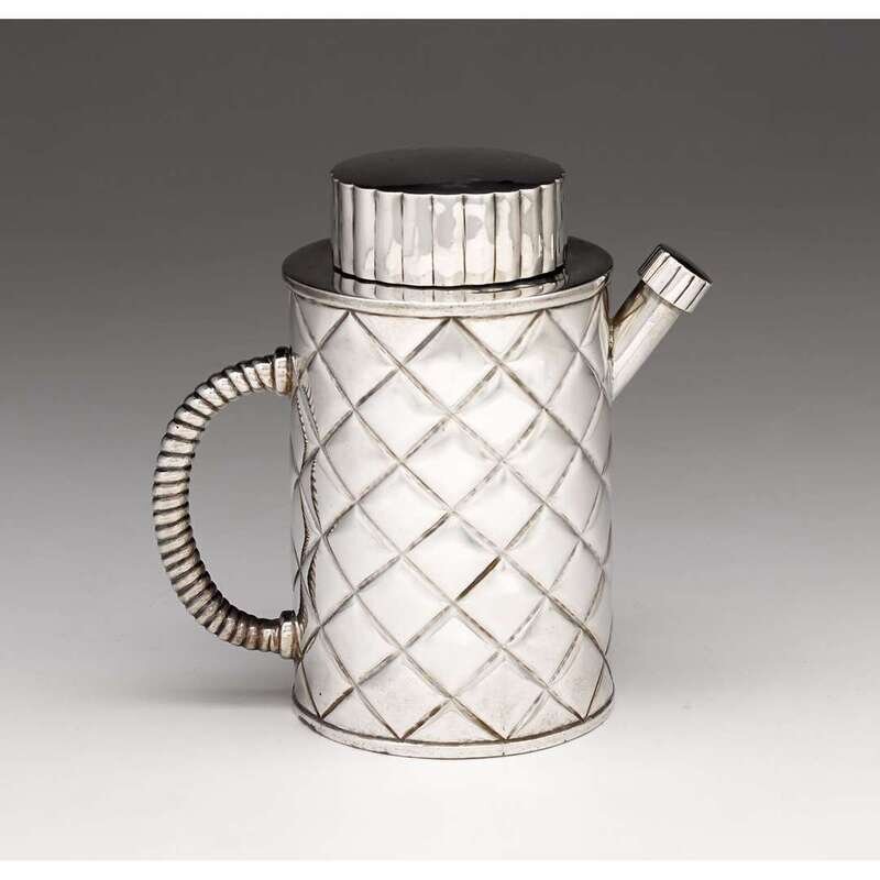 The cylindrical body of quilted design with removable fluted cover, the underside marked with "Ortega/Mexico/925" each within rectangular cartouche, an eagle mark, and the number 28117; the design in the manner of Sigvard Bernadotte for Georg Jensen.