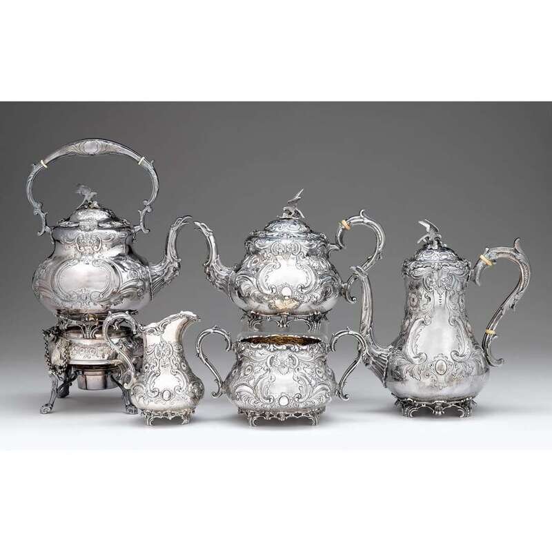 Comprising a hot water kettle on stand (silver-plated), a coffee and teapot, creamer, and open sugar, of baluster form heavily repoussé-worked and chased with C-scrolls, foliage, and floral blossoms, each spout in the form of an eagle's mouth with mask where spout joins body, bird-form finials, raised on openworked scroll feet, the undersides with scratch numbers and engraved "390." (5).