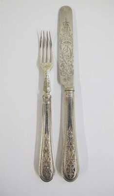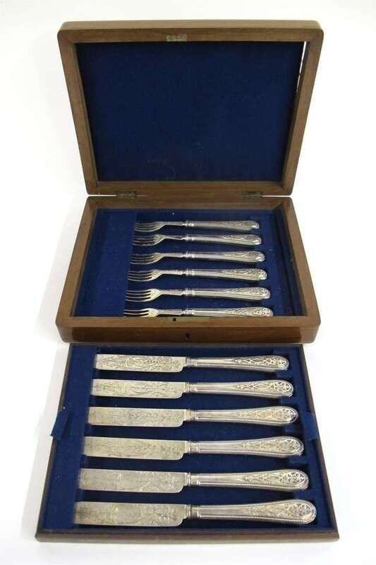 Comprising six each luncheon knives and forks, the blades elaborately engraved with scrolling foliage and fruit, the handle with arabesques within a beaded border, the terminals with family crest of an arm in armour, in fitted wood box. (12).