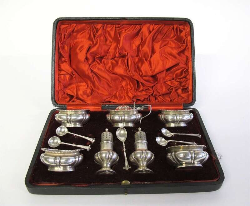 Including four open salts with lobed body and gadrooned rim, one mustard pot with cobalt liner, a pair of salt and pepper shakers, four salt spoons, and one mustard spoon; in fitted box.