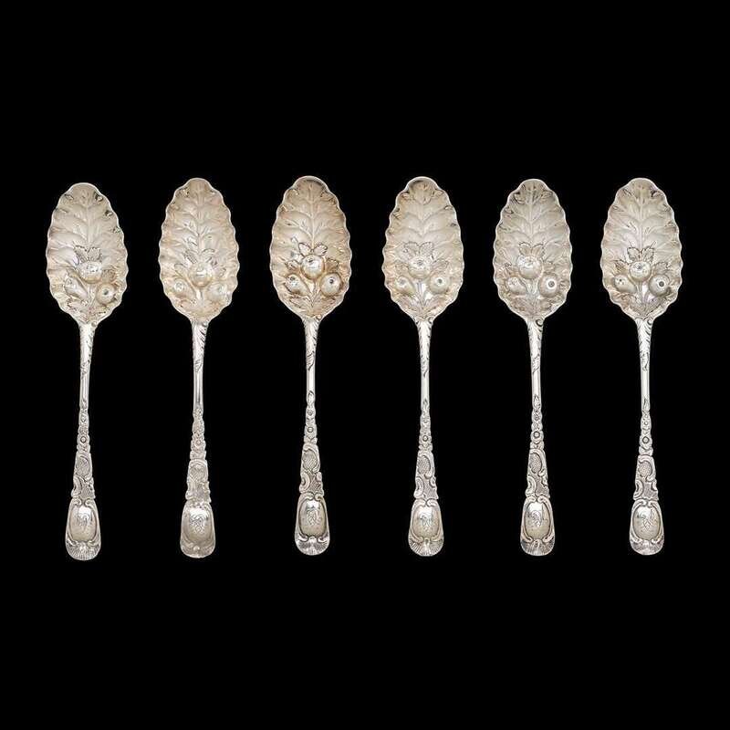 The fruit embossed bowl leading to a floral and foliate engraved handle, monogrammed to terminal. (6).