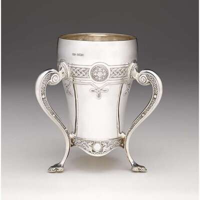 Baluster form, the shoulder with repoussé band of arabesques centered by medallions, the bottom of cup with openworked band depicting intertwined dragons, with three S-scroll handles with similar motif, the underside with scratch number and stamped "Russells LTD 10 Exchange St Manchester."