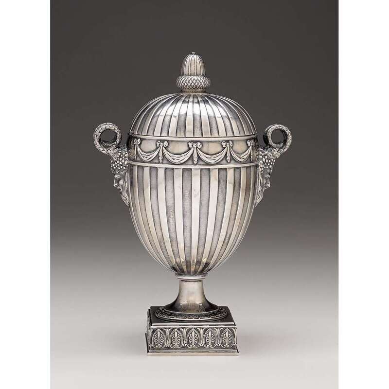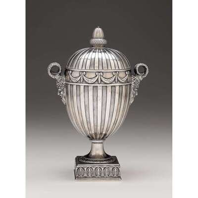 Oviform reeded body with twin satyr masks to each side, the shoulder with panel of swags suspended by bows, raised on square plinth with anthemions along edge, hallmarked to body and interior of cover, with pattern number 849 to underside.