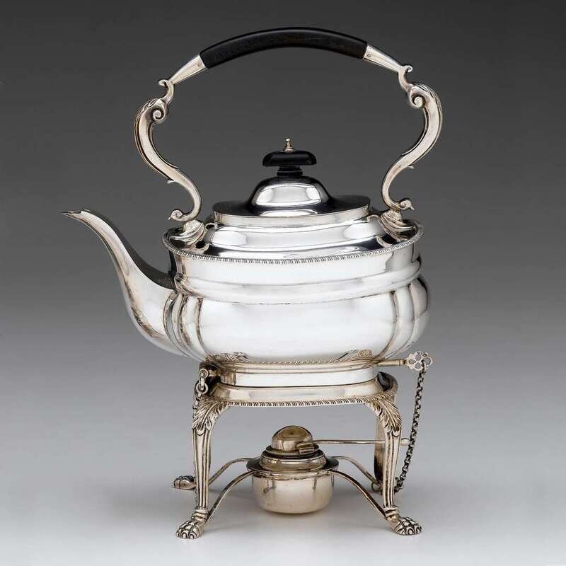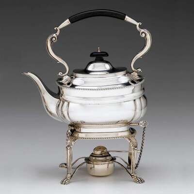 George V silver hot water kettle on stand C S Harris & Sons, Ltd., London, 1911-12