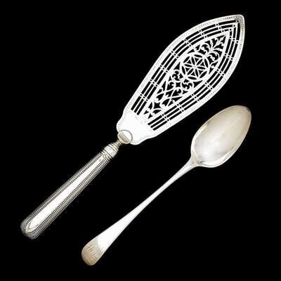Including a fish slice with reticulated blade and beaded handle, the later handle with maker's mark I.C; and a tablespoon, monogrammed. (2).