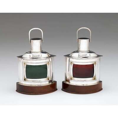 Modeled in the form of a ship lantern, one engraved "Port" with red lens, the other engraved "Starboard" and with green lens, the hinged lid opening to reveal two-section wooden interior. (2).
