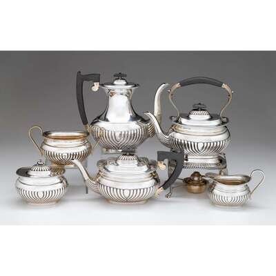 Comprising a hot water kettle on stand, coffee and teapot, covered sugar, creamer, and wastebowl, oval bulbous form with fluted lower half and gadrooned rim, with wooden finials and handles. (6).