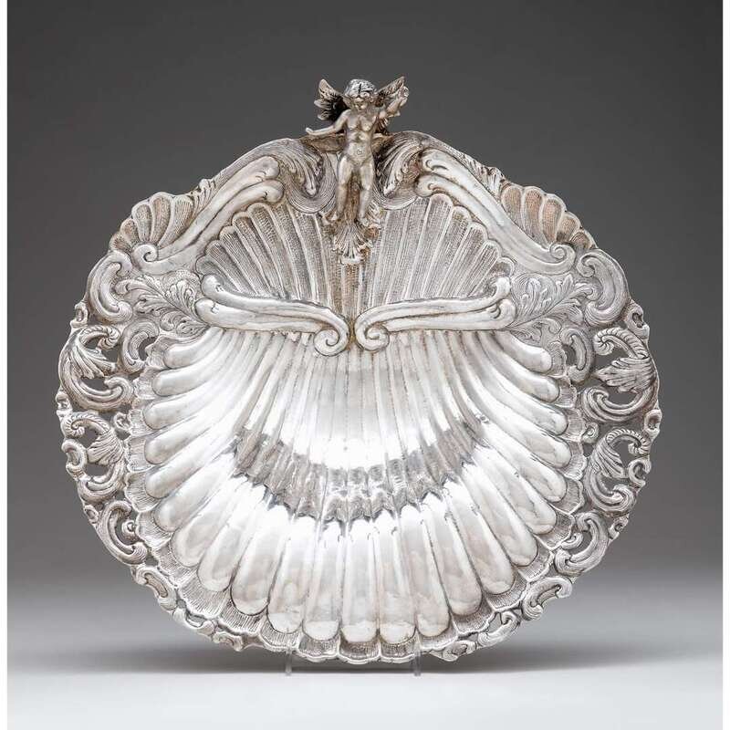 Modeled as a shell with openworked C-scroll rim surmounted by a winged figure, raised on three openworked feet, .800 standard.
