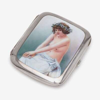 German silver and painted enamel erotic subject cigarette case late 19th/early 20th century