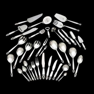 "Acorn" pattern, comprising fifteen dinner knives; six each steak and luncheon knives; twelve each butter spreaders (three slightly smaller), condiment forks, and demitasse spoons (in original box); eleven salad forks; ten dinner forks (one slightly smaller); eight each grapefruit spoons and teaspoons; five cream soup spoons; two serving spoons; two pairs of salad serving forks and spoons; one larger salad serving fork and spoon; one each gravy ladle, jelly knife, pierced tomato server, cheese plane, bottle opener, cake knife, serrated cheese knife, fish server, fish serving fork, meat fork, pastry server, sardine server, strawberry fork, tablespoon, and bar knife; together with eight iced tea spoons in the "Reigning Beauty" pattern by Heirloom Sterling. (136).