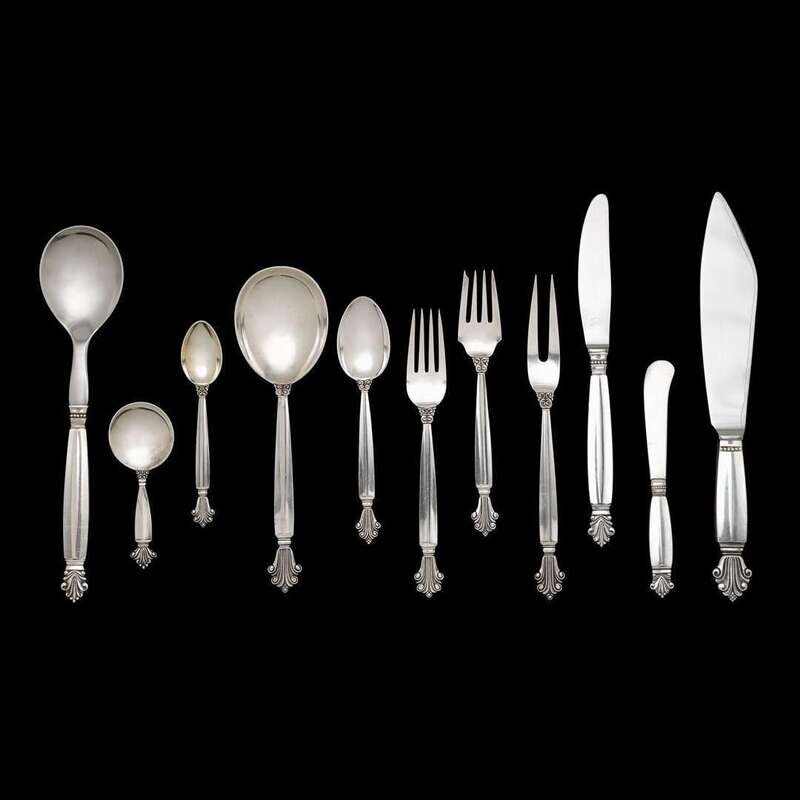 "Acanthus" pattern, comprising eight each dinner and salad forks, demitasse spoons; ten dinner knives; nine teaspoons; three serving spoons; one each butter spreader, meat fork, caddy spoon, and cake server. (60).