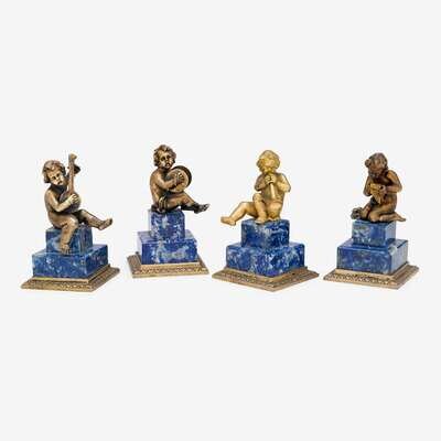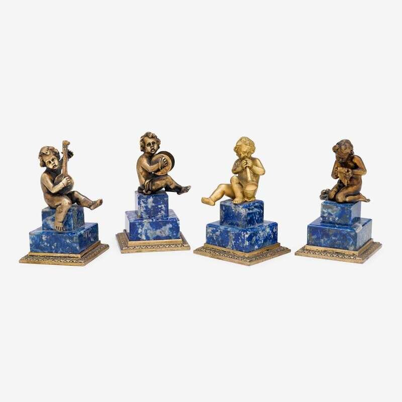 Modeled as musical cherubs, each playing a different instrument resting on square-form lapis lazuli and silver-gilt bases, .800 standard. (4).
