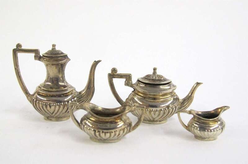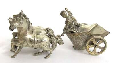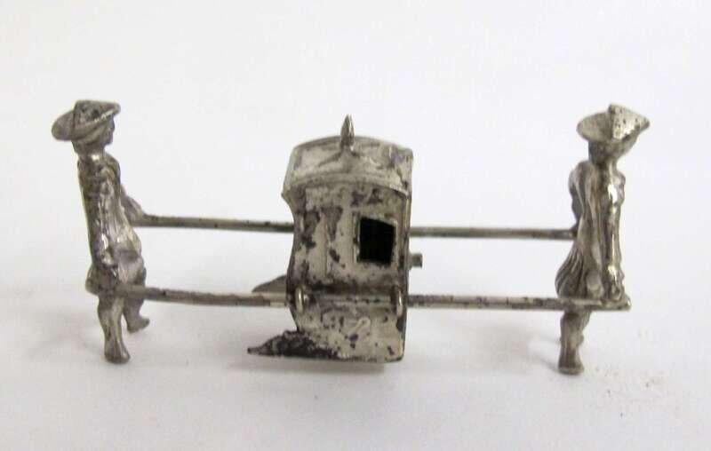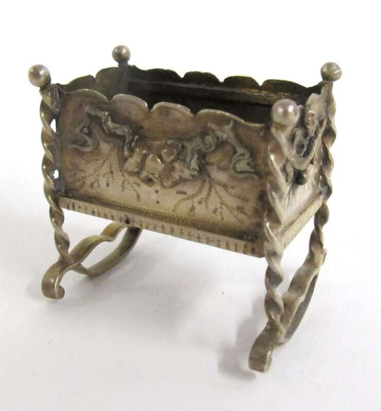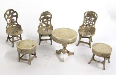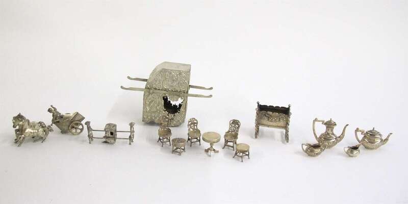 Including a German silver Chinese sedan with Hanau marks; a smaller Chinese sedan, probably Dutch; a German silver chariot led by three horses; a miniature tea and coffee service with creamer and sugar by P.H. Vogel & Co., London, 1965-66; three chairs and three tables inset with Chinese coins, early 20th century; a crib with maker's marks rubbed, and other miscellaneous items. (18).