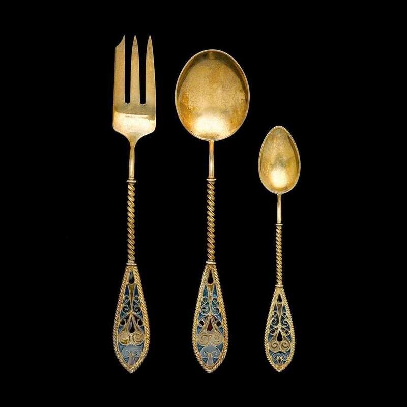 Comprising twelve each dessert forks, dessert spoons, and demitasse spoons, spiral handle with blue, green, red, and yellow enameled terminal within rope-form border. (36).
