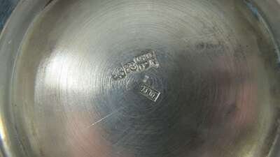Cylindrical body raised on circular pedestal foot with hinged domed cover, incised band on florals and foliage within a beaded border, with angular wooden handle, 84 zolotnik.