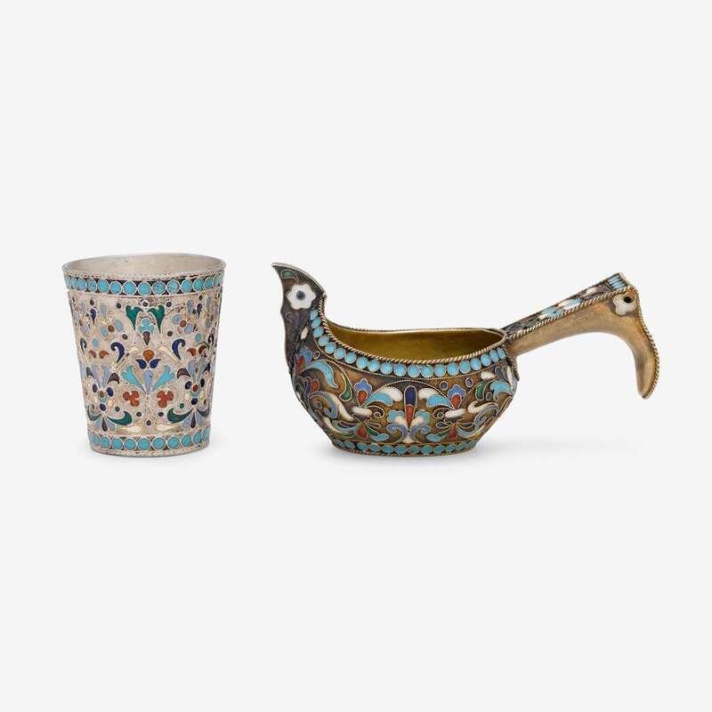 Including a kovsh, possibly by Nicholai Zugeryev, the body enameled in shades of red, blue, green, and white within a turquoise beaded border; the second a vodka cup with similar design, unidentified maker, 84 zolotnik. (2).