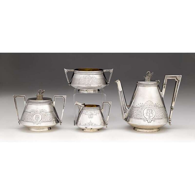Comprising a teapot, creamer, covered sugar, and wastebowl, of conical form, the body engraved with band of rosettes and scrolling foliage centered by a monogram within a circular cartouche, the teapot and sugar surmounted by a swan-form finial, the creamer of slightly different decoration, 84 zolotnik. (4).