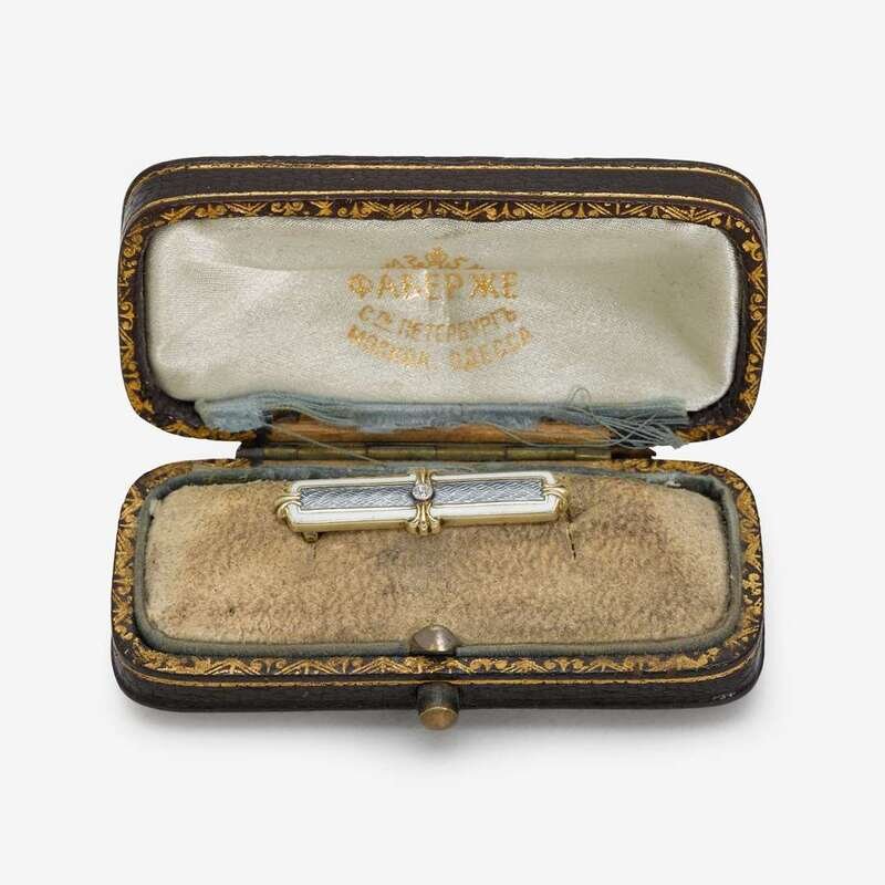 Russian guilloché enameled, 14-karat gold and diamond pin marked for Fabergé