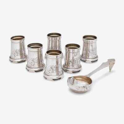 The beakers of cylindrical form, the kovsh with elongated hook handle, each piece engraved with stylized rooster, 84 zolotnik. (7).