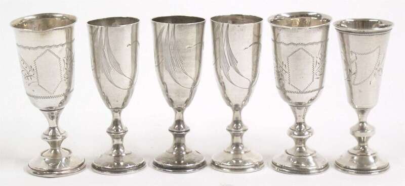 Six Russian silver vodka cups Kostroma, 1908-26, unidentified makers