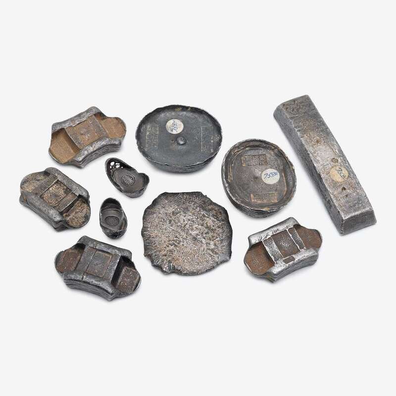 Comprising four of saddle form, two of kettledrum form, and two of snail form, each bearing various seals; together with one unmarked ingot of circular form, and one Vietnamese lang. (10).