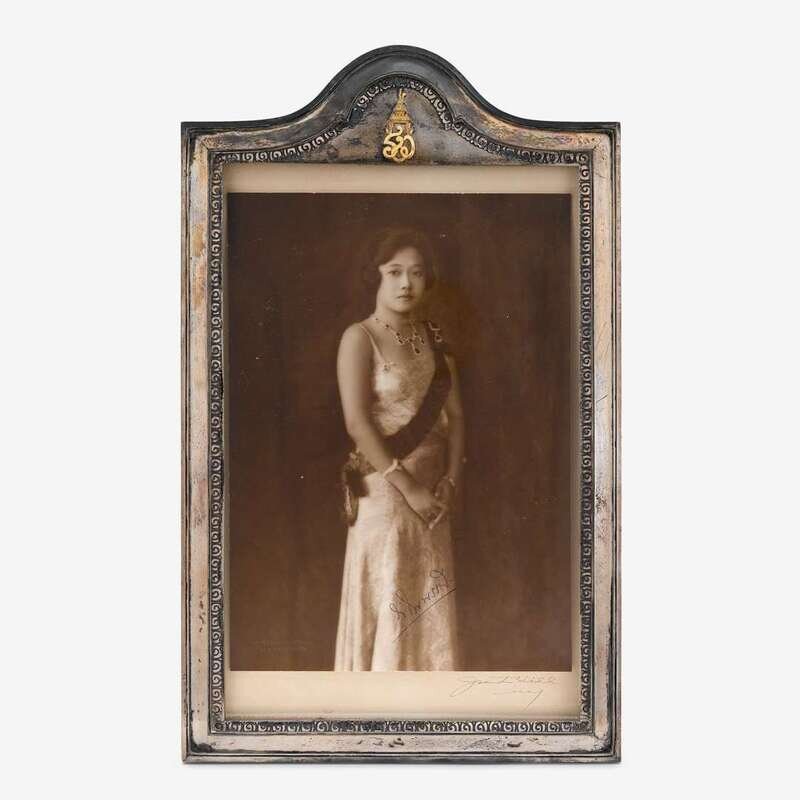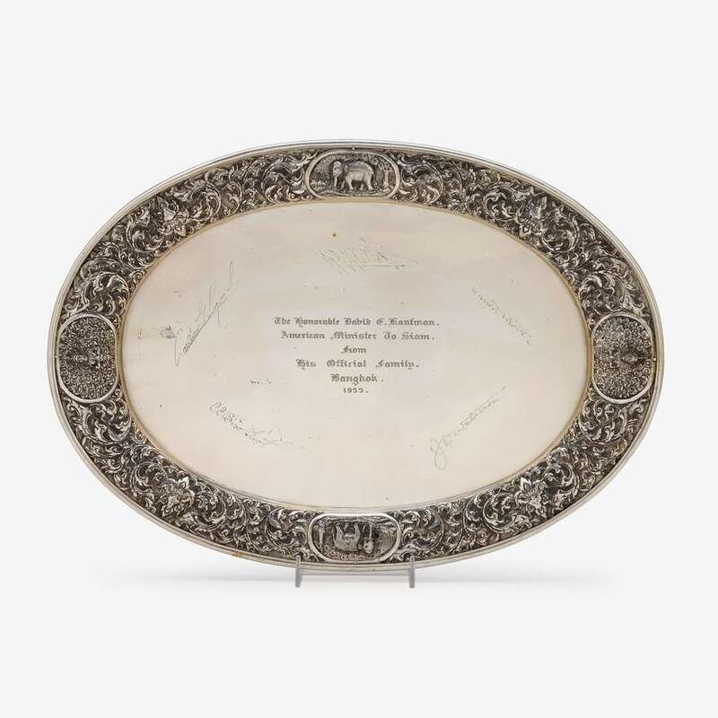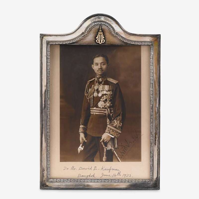 Rectangular silver frames apparently unmarked, with signed portrait photographs of King Prajadhipok (r. 1926-1935) and the Queen Consort Rambai Barni, each frame mounted with a plaque bearing the monarch's royal seal below the great crown of victory; the photo of Prajadhipok with handwritten note "To Mr. David E. Kaufman Bangkok, June 14th, 1933"; together with a Thai silver presentation platter engraved with inscription "The Honorable David E. Kaufman American Minister to Siam from his official family. Bangkok 1933." (3).